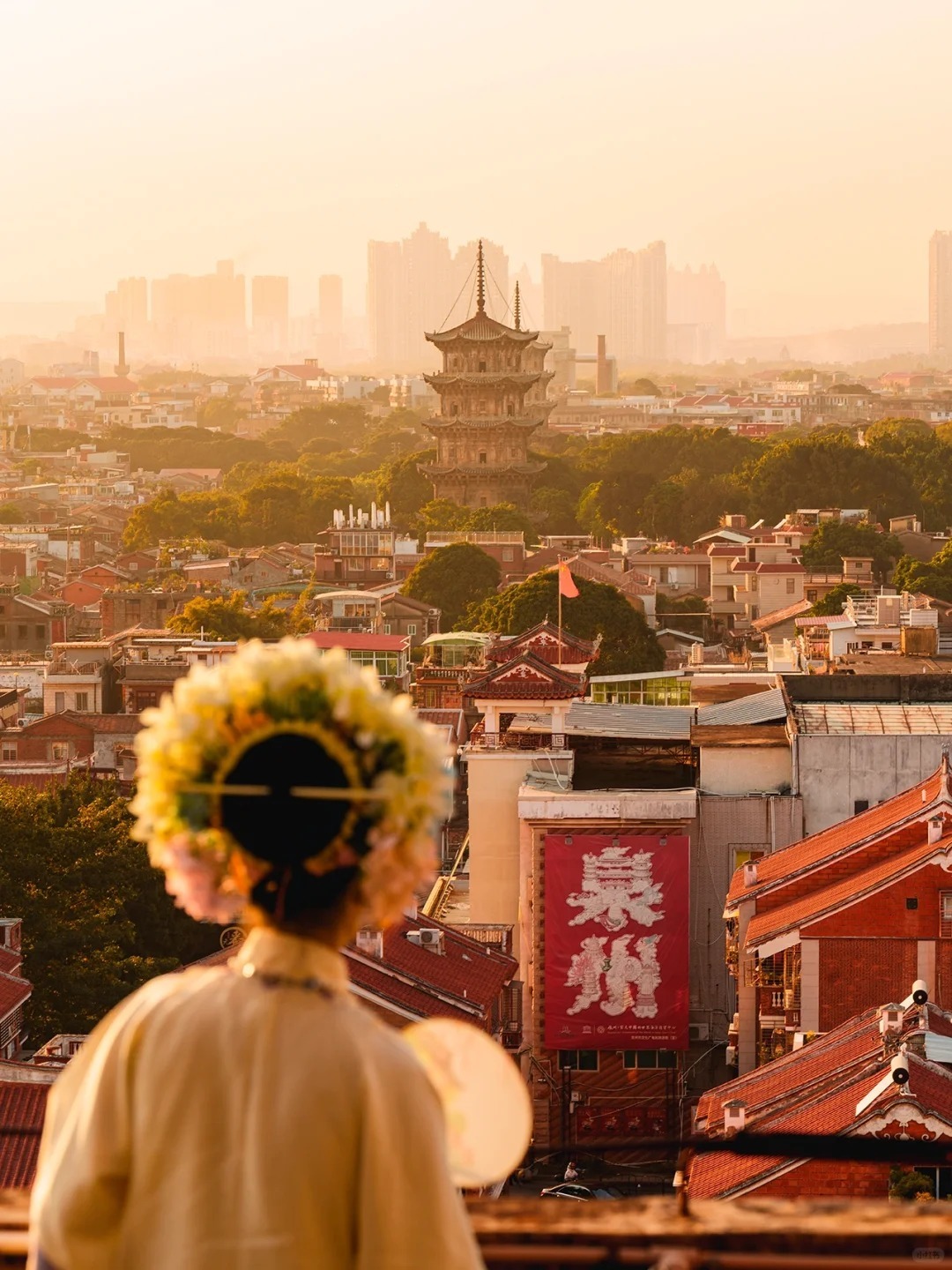 紧接着前往【开元寺】开元寺位于福建省泉州市鲤城区西街,始建于唐朝的开元寺和东西二塔,是泉州的地标,是中国东南沿海重要的文物古迹,也是福建省内规模最大的佛教寺院。除了厚重的文化感,开元寺里的红墙、长廄,东西塔,都是非常好的打卡拍照点;主殿的外墙:一片红色,在温暖阳光下,格外亮眼,让你有一种“闽南故宫”的感觉。【西街】西街融合了泉州的许多老街巷,有古时的驿站,官邸人家,也有今日满街都是的泉州本土饮食和生活物件,特别生活化的一条街道。光是传统的、平行的视角怎么够呢?我们为你在找寻到一处至高点,可以俯瞰整个西街的熙熙攘攘的“烟火气”可以和东西塔来一组“小鸟依人”的合影;