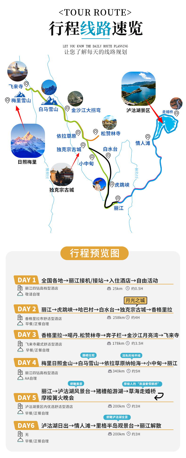 2、住宿:全程5晚优选当地酒店(丽江2晚四钻高档型酒店,德钦1晚舒适型酒店,香格里拉1晚舒适型酒店,泸沽湖1晚舒适型酒店);