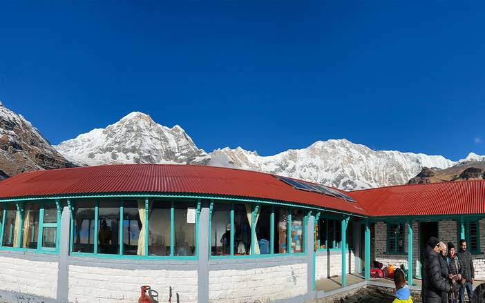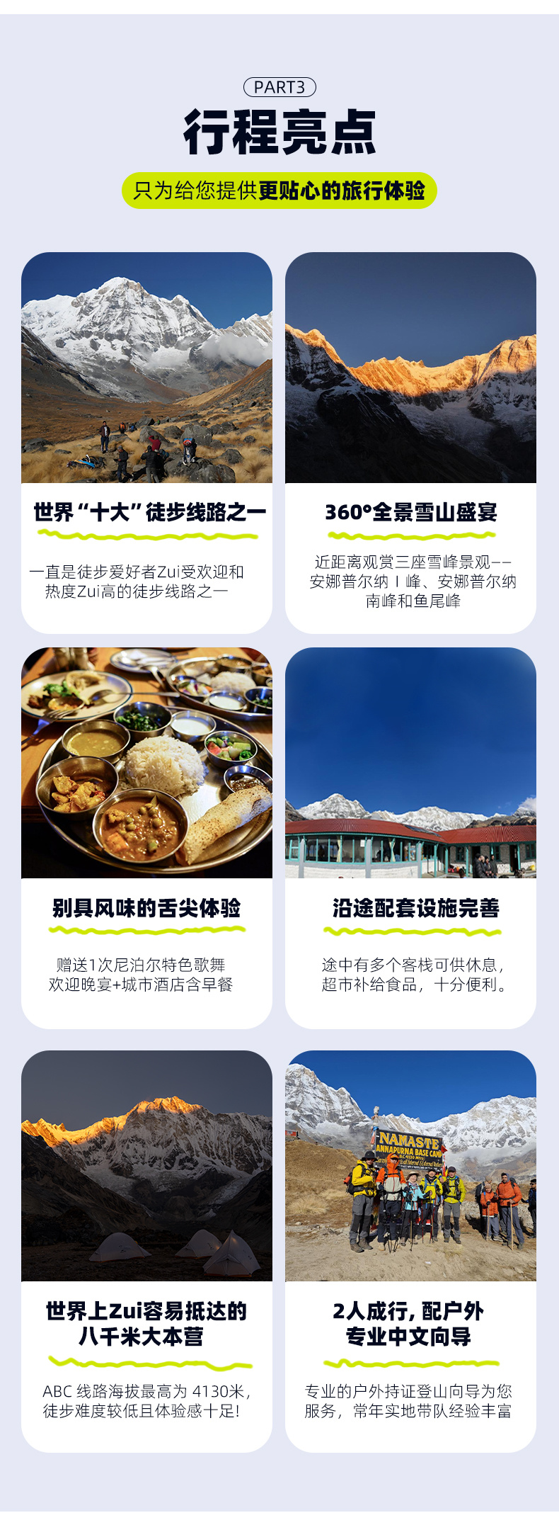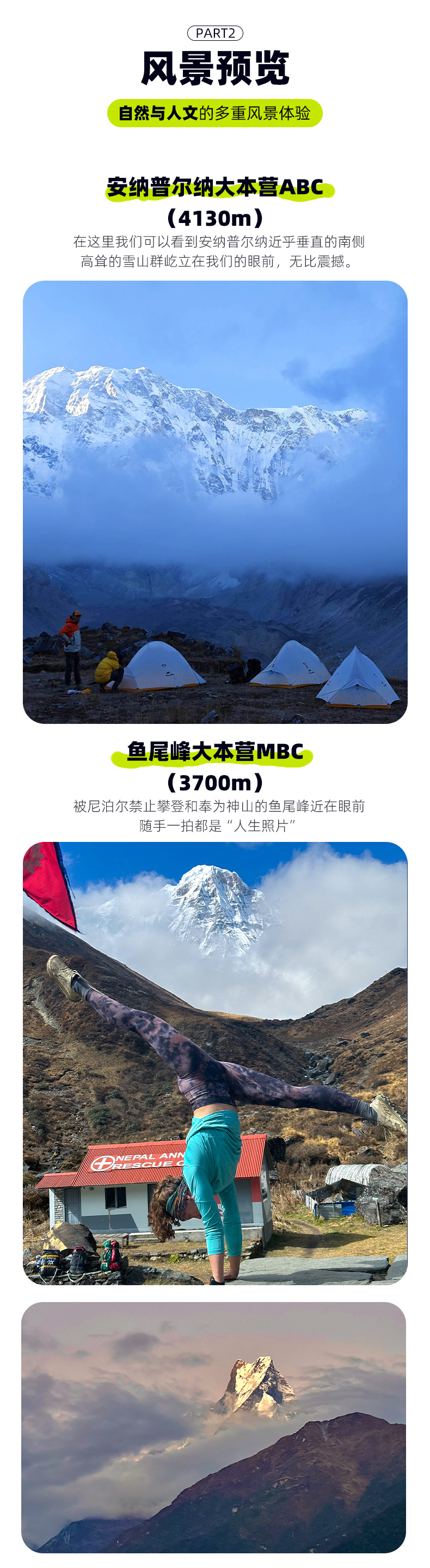 【行程概述】今天全程很多上上下下路段,还有很多台阶,所以要带好护膝,路过不少补给点有美味的咖啡奶茶,还有当地的特色美食,到了鱼尾峰大本营MBC也是会看到很漂亮的景色的观景平台之一。徒步时间约为6-7小时,途经鱼尾峰大本营MBC(3700m),到达ABC大本营(4130m),这段路上我们会看到安娜普尔纳Ⅰ峰(8091m)、安娜普尔纳南峰(7200m)、鱼尾峰(6993m)、安娜普尔纳III峰(7500m)、辛楚力峰(6440m)等。 今日徒步距离约为9公里。