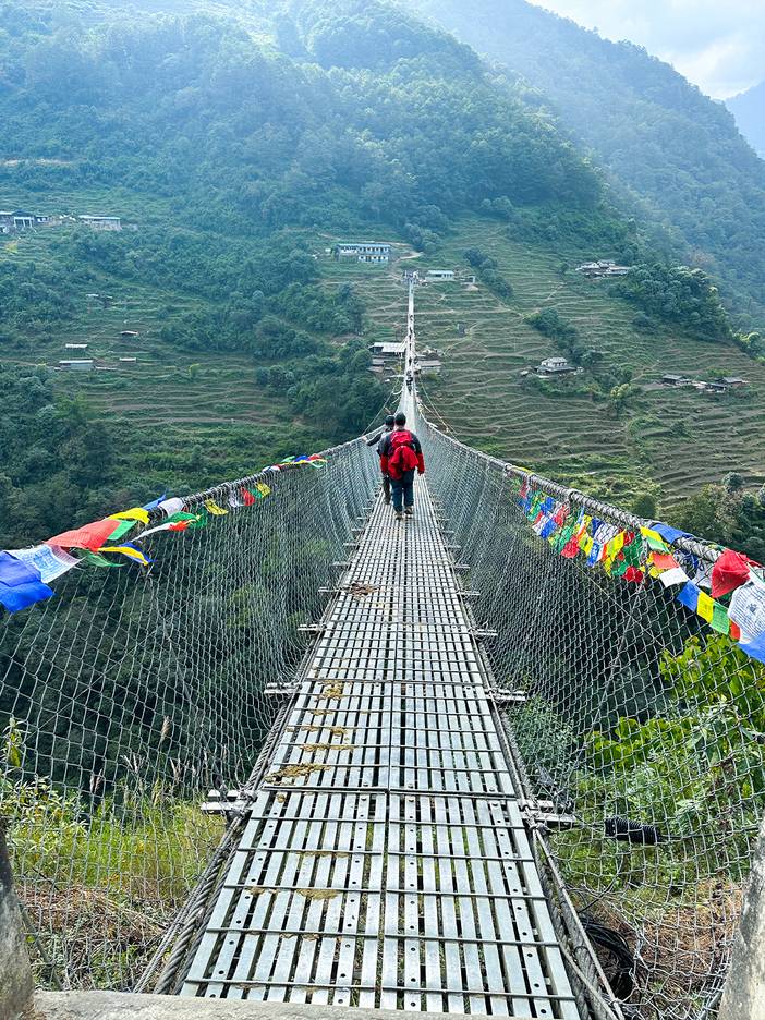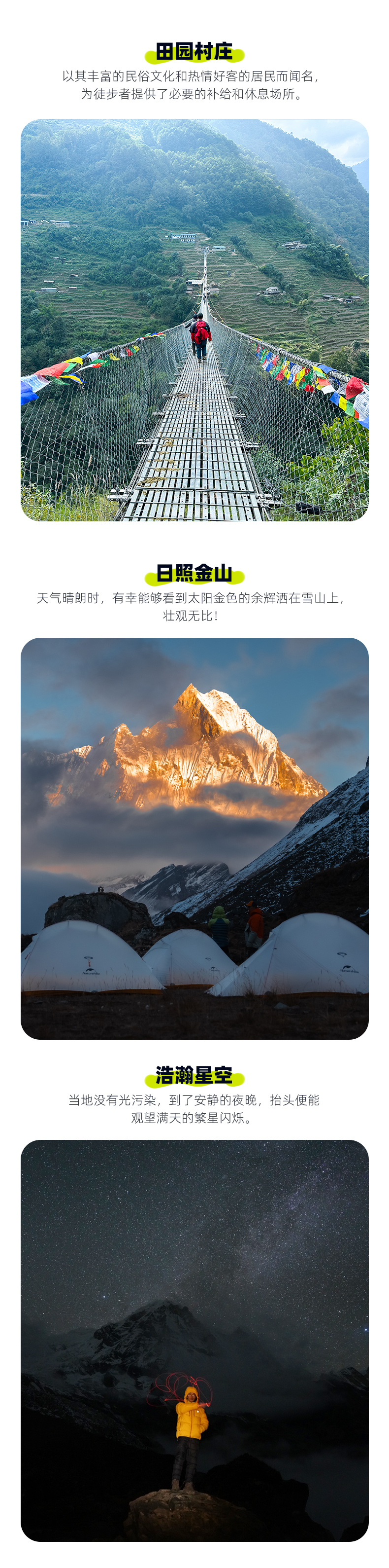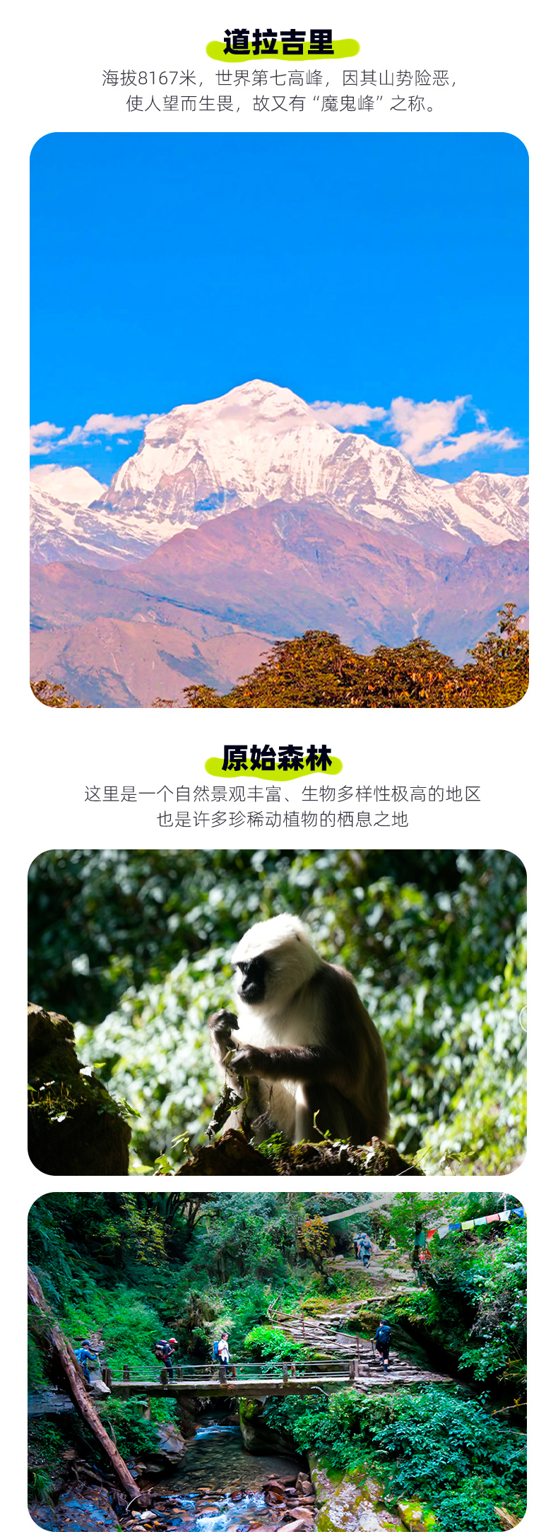 【行程概述】早餐过后,出发乘坐越野车前往徒步起点吉努旦达Jhinudanda(2170m)。抵达后我们开始徒步,穿过长长的吊桥,沿路上上下下,徒步时间约为2.5小时。很快就会抵达休息点乔木隆Chromorng海拔2170m。在这里更是可以看到古朴的村庄,以及美丽的雪山(安娜普尔纳南、鱼尾峰、安娜普尔纳3号峰等)。沿着蜿蜒曲折的山路先下后上翻越河谷,一路向上徒步到达西努瓦Sinuwa(2300m),在这里你会看到美丽的梯田,潺潺的流水瀑布,美丽的雪山等。路上会穿过美丽宁静的竹林,绕过一座座大山,你会不由自主得感叹大自然的鬼斧神工。全天徒步时间约7小时,徒步距离约为10公里。