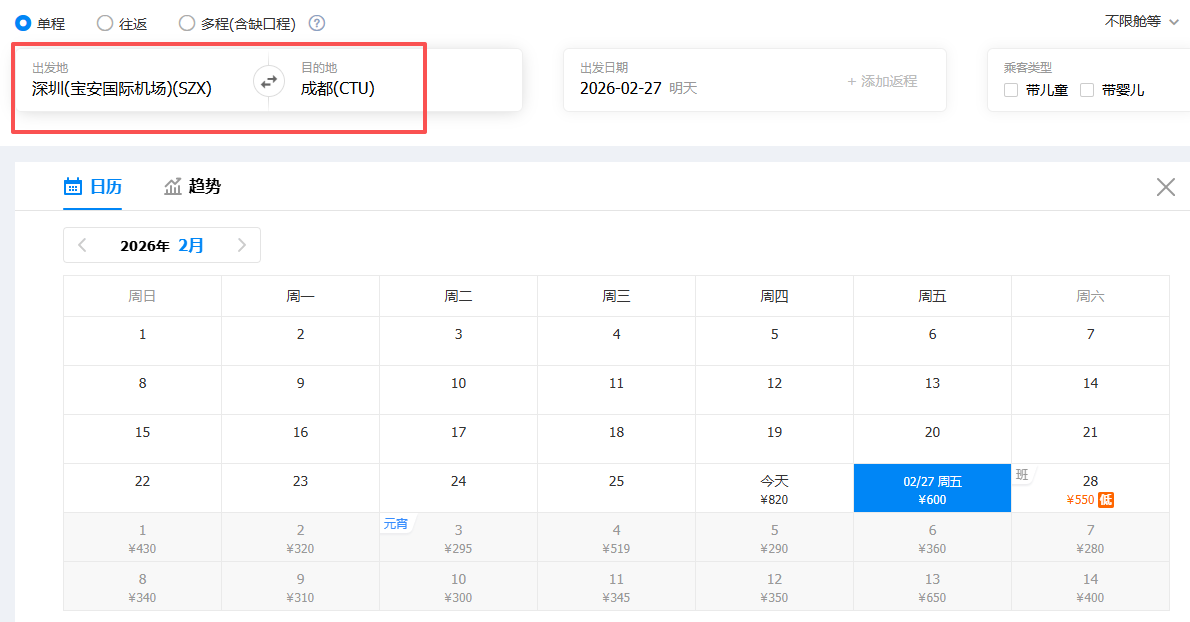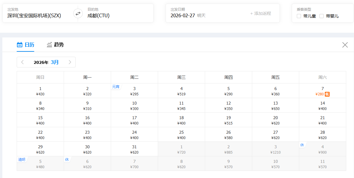 深圳直飞成都,机票价格低至280元起!