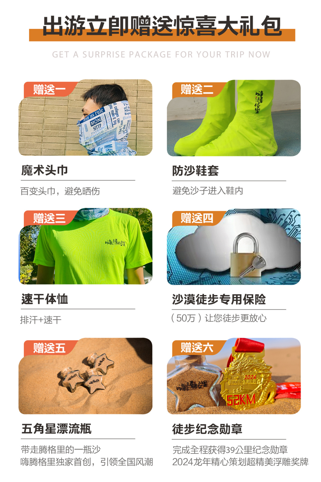 01 此腾格里徒步活动不同于传统旅游线路,对参加队员的安全、环保和团队协作精神要求较高,要求体现中华传统美德。全程徒步过程中,严禁丢弃任何不可降解垃圾,组委会提供大型编织袋垃圾袋,所有垃圾请归拢至垃圾袋,由物资车统一运出沙漠。