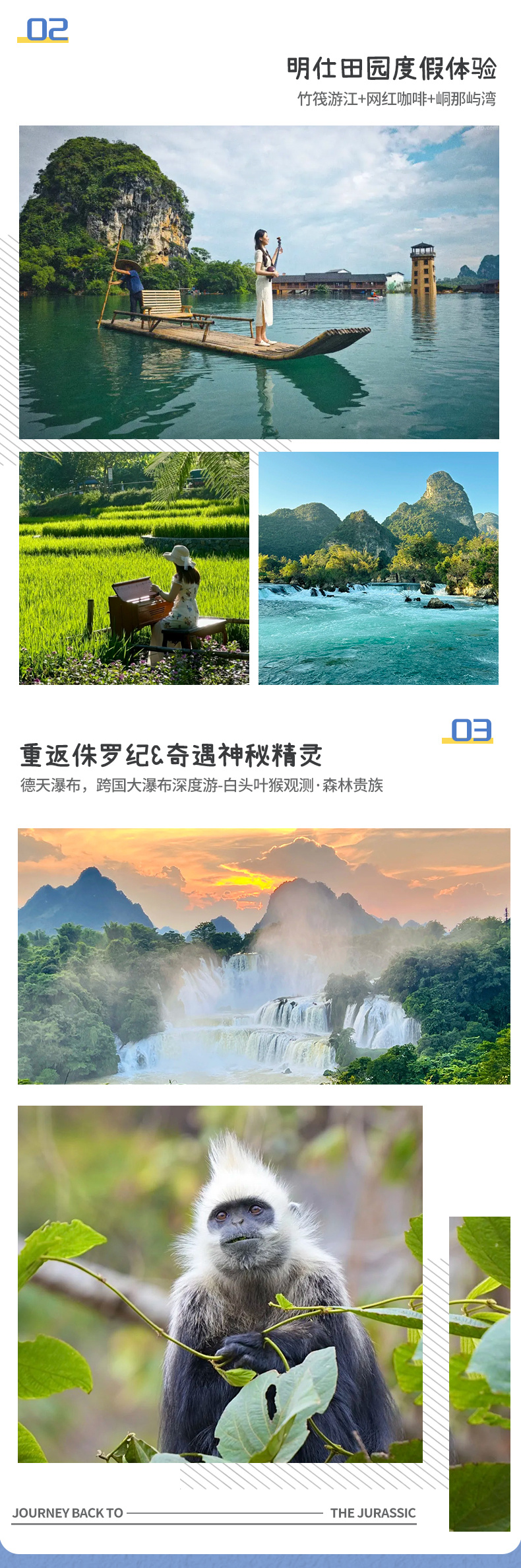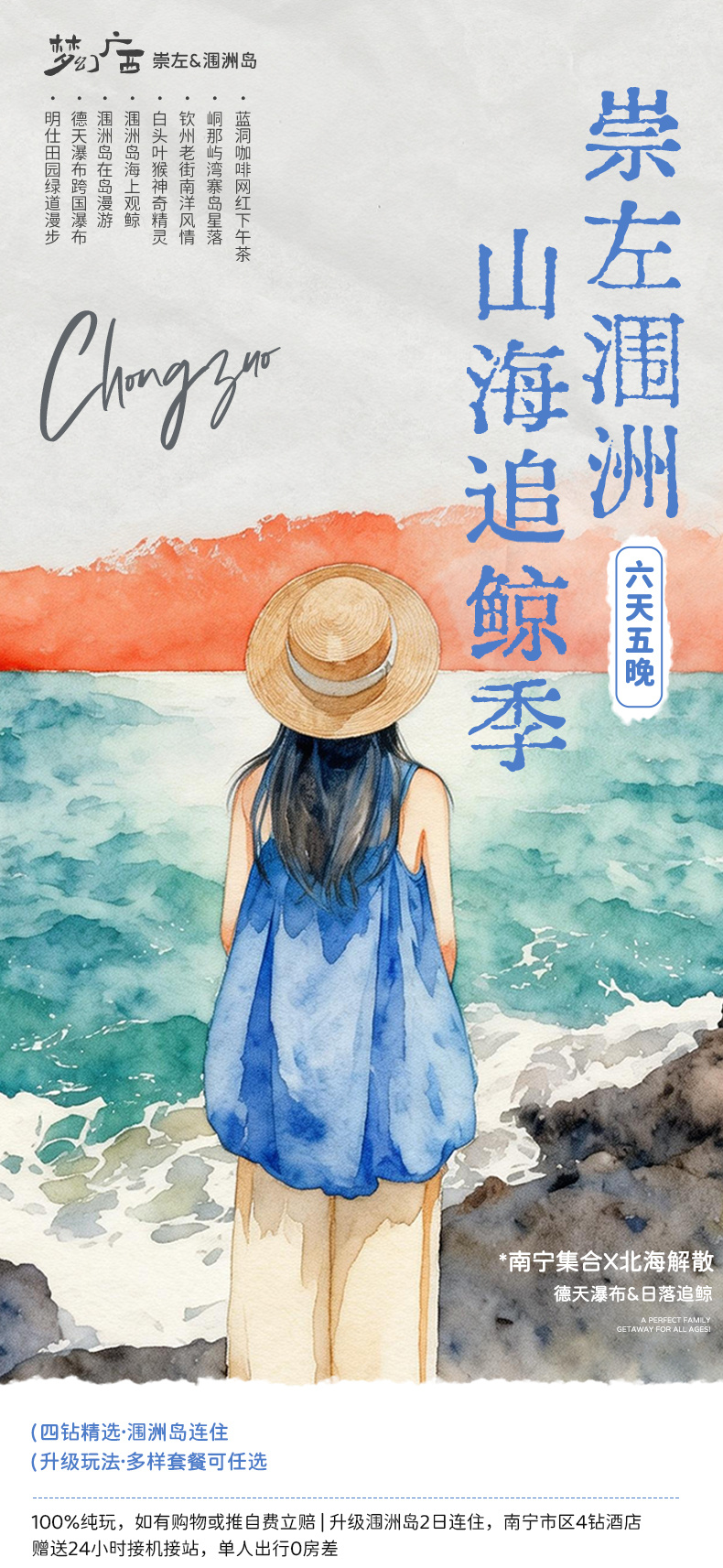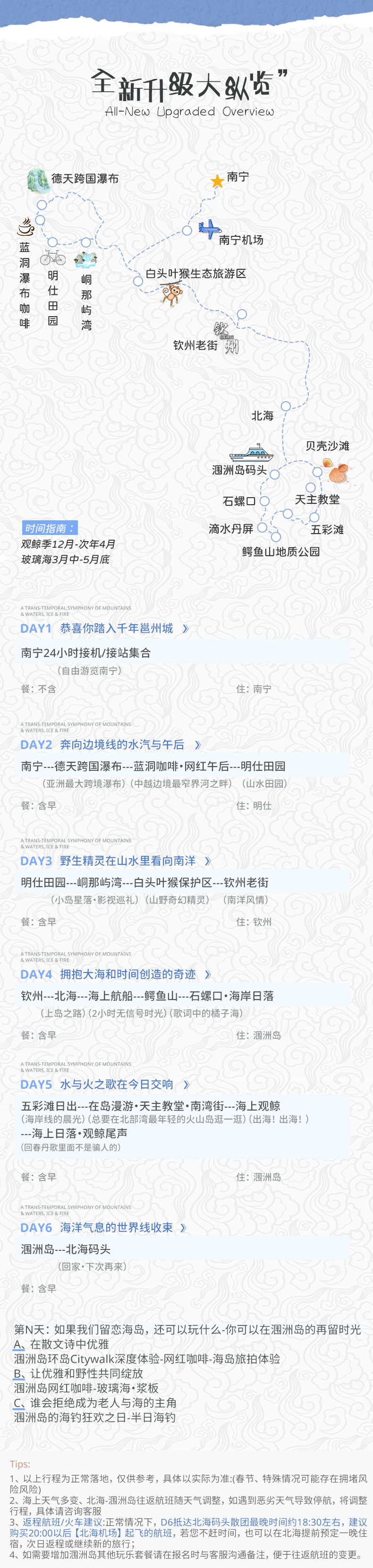 4、门票:德天瀑布(含景交车)、峒那屿湾(水陆联票)、白头叶猴旅游区(含电瓶车)、涠洲岛上岛费、涠洲岛船票、出海观鲸体验;