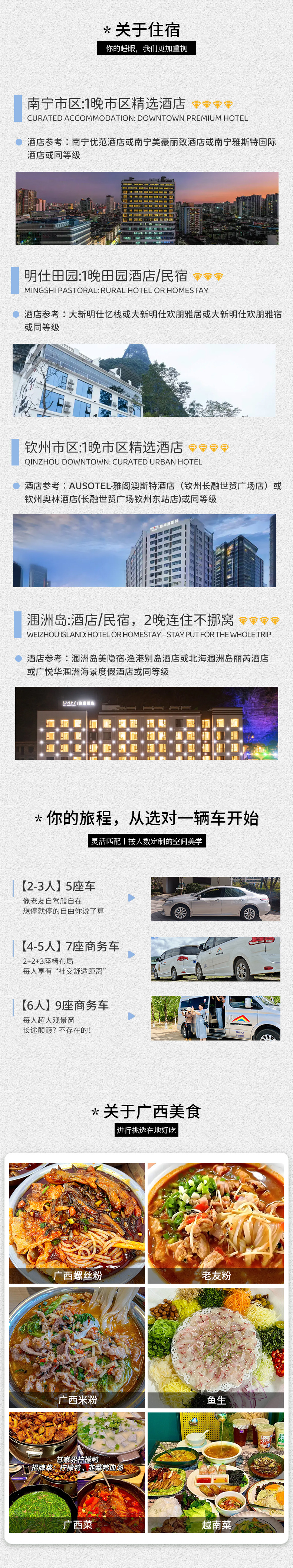 1、住宿:南宁1晚四钻酒店(参考南宁优范酒店或南宁美豪丽致酒店或南宁雅斯特国际酒店火同等级)、明仕田园1晚酒店/民宿(参考大新明仕忆栈或大新明仕欢朋雅居或大新明仕欢朋雅宿或同等级)、钦州1晚四钻酒店(参考:AUSOTEL·雅阁澳斯特酒店(钦州长融世贸广场店)或钦州奥林酒店(长融世贸广场钦州东站店)或同等级)、涠洲岛2晚四钻酒店/民宿(参考:涠洲岛有美隐宿·渔港别岛酒店或北海涠洲岛丽芮酒店或同等级);