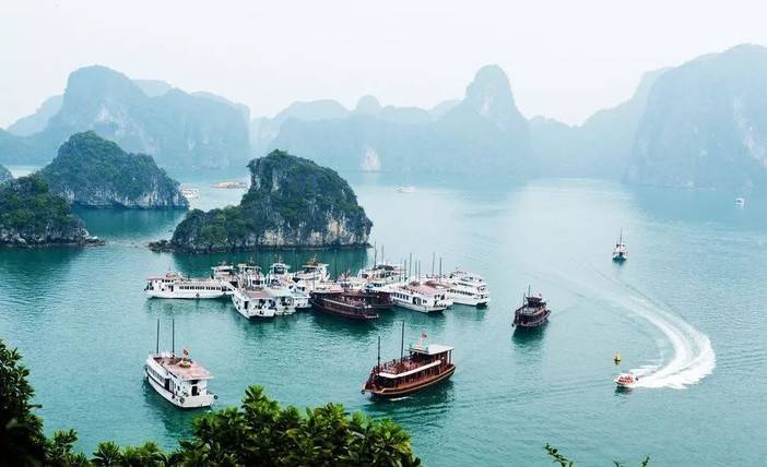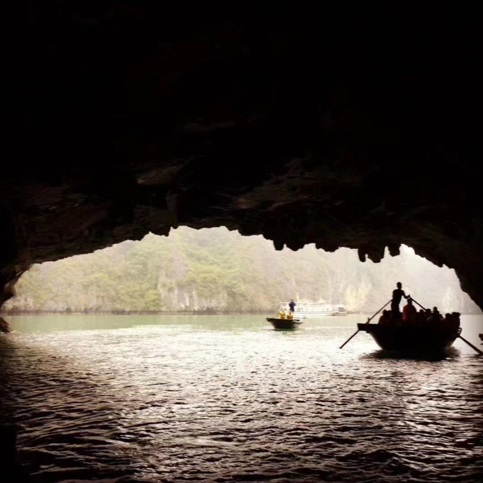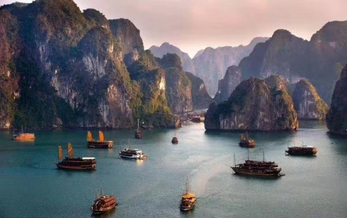 下龙湾-蔚蓝的还平面朦胧中愈来愈近青黛的山丘矗立在海上。喀斯特地貌描绘出一幅壮美的山水画卷,山上植被茂密郁郁葱葱,海面水平似镜。轻漫的薄雾像一件披纱盈盈的搭在诸多山丘上连成一片,好一幅山水大写意,浓墨重彩都无法与之争艳。这就是世界七大自然遗产,素有“海上桂林”之称的越南下龙湾。它纯真甜美,不施粉黛却靓丽逼人,仅仅是让您仰望一下,也会感到束手无策,无所适从……