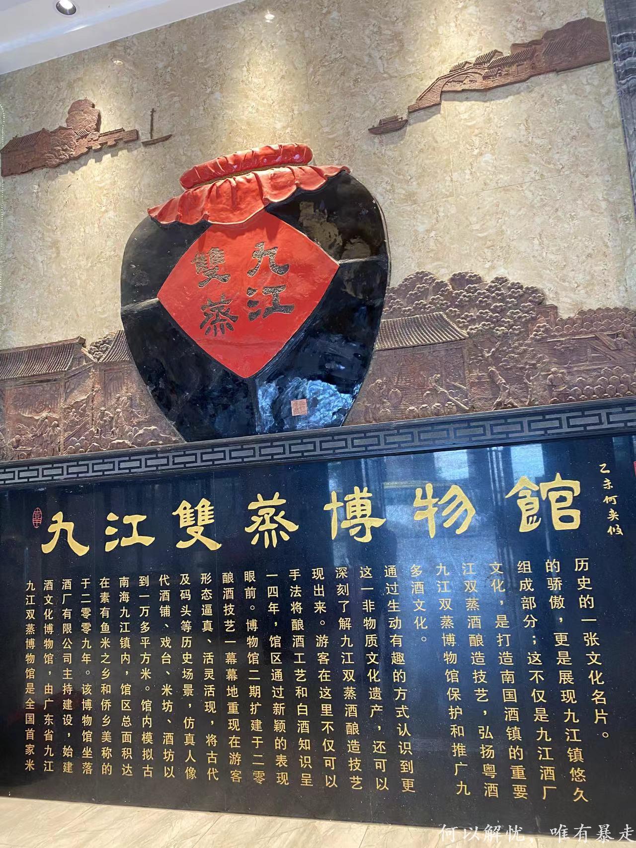 九江双蒸博物馆是由广东省九江酒厂有限公司于2009年在佛山市南海区九江镇建成开放的企业文化博物馆,位于惠民路12号,规划建筑面积约4000平方米,是国内首个以米酒文化为主题的非遗展示馆,现为国家AAA级旅游景区 。该馆以省级非物质文化遗产“九江双蒸酿造技艺”为核心展示内容,设有历史场景复原、工艺展区及文化长廊,免费向公众开放并提供导览服务。