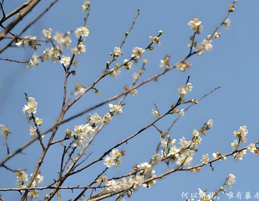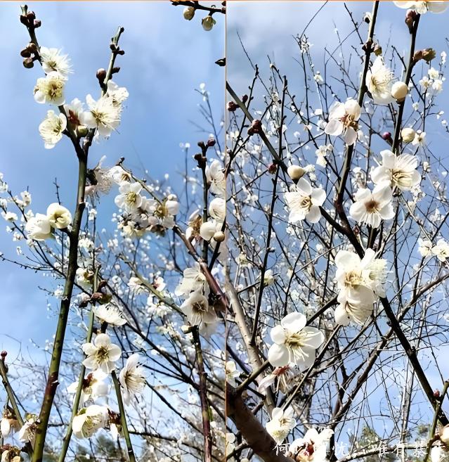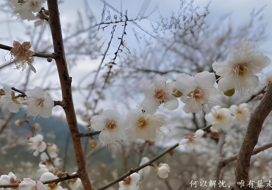 梅花谷占地6000多亩,拥有万余株梅树,形成规模壮观的“香雪海”景象;梅树多依山势种植,树龄普遍超过30年,每年12月下旬至次年1月上旬进入盛花期,花期可持续至1月中下旬,当前正值观赏佳期,花朵洁白如雪,香气清雅,与周边山林、溪瀑和灰瓦屋顶相映成趣。