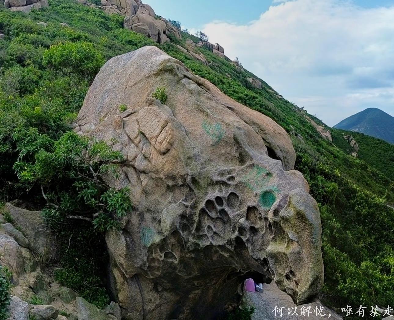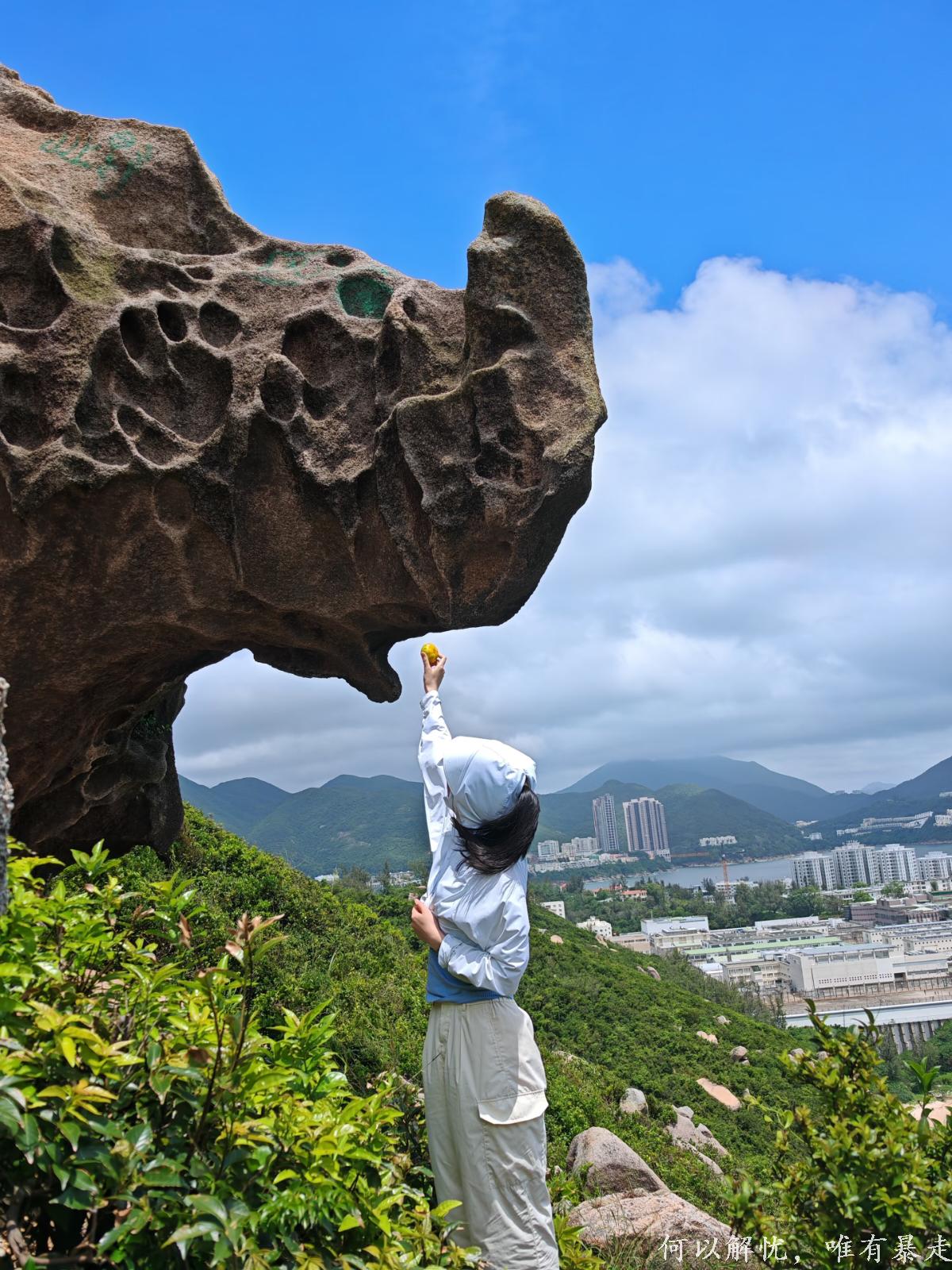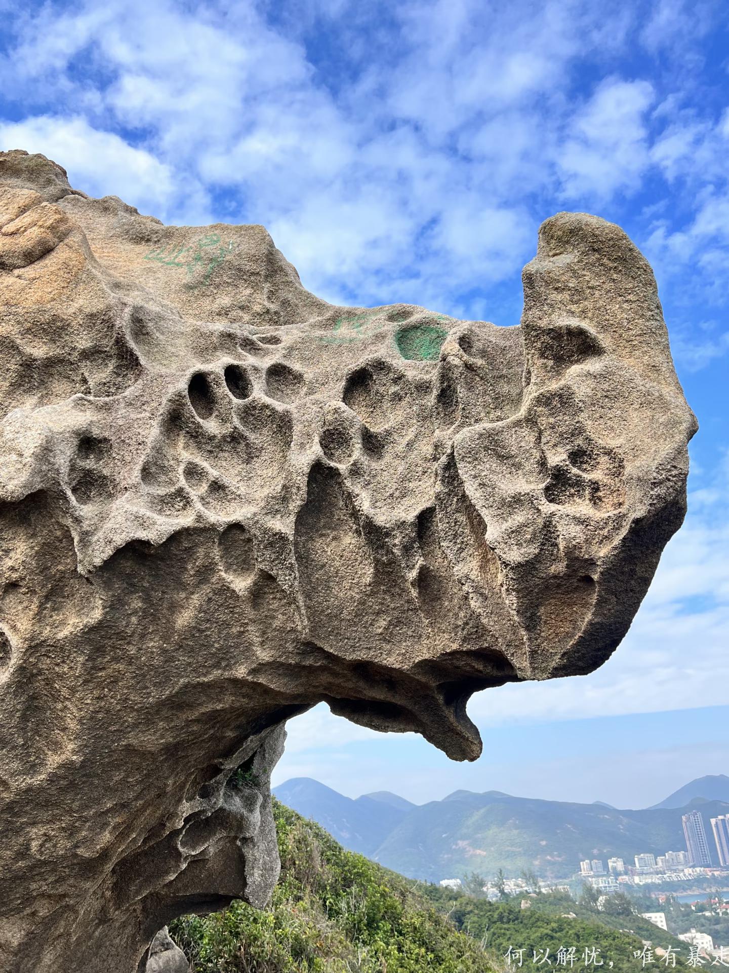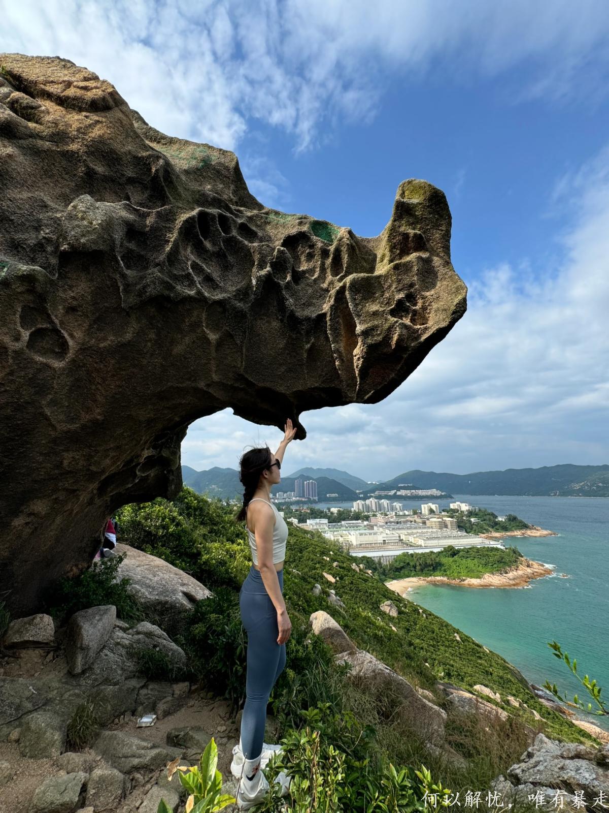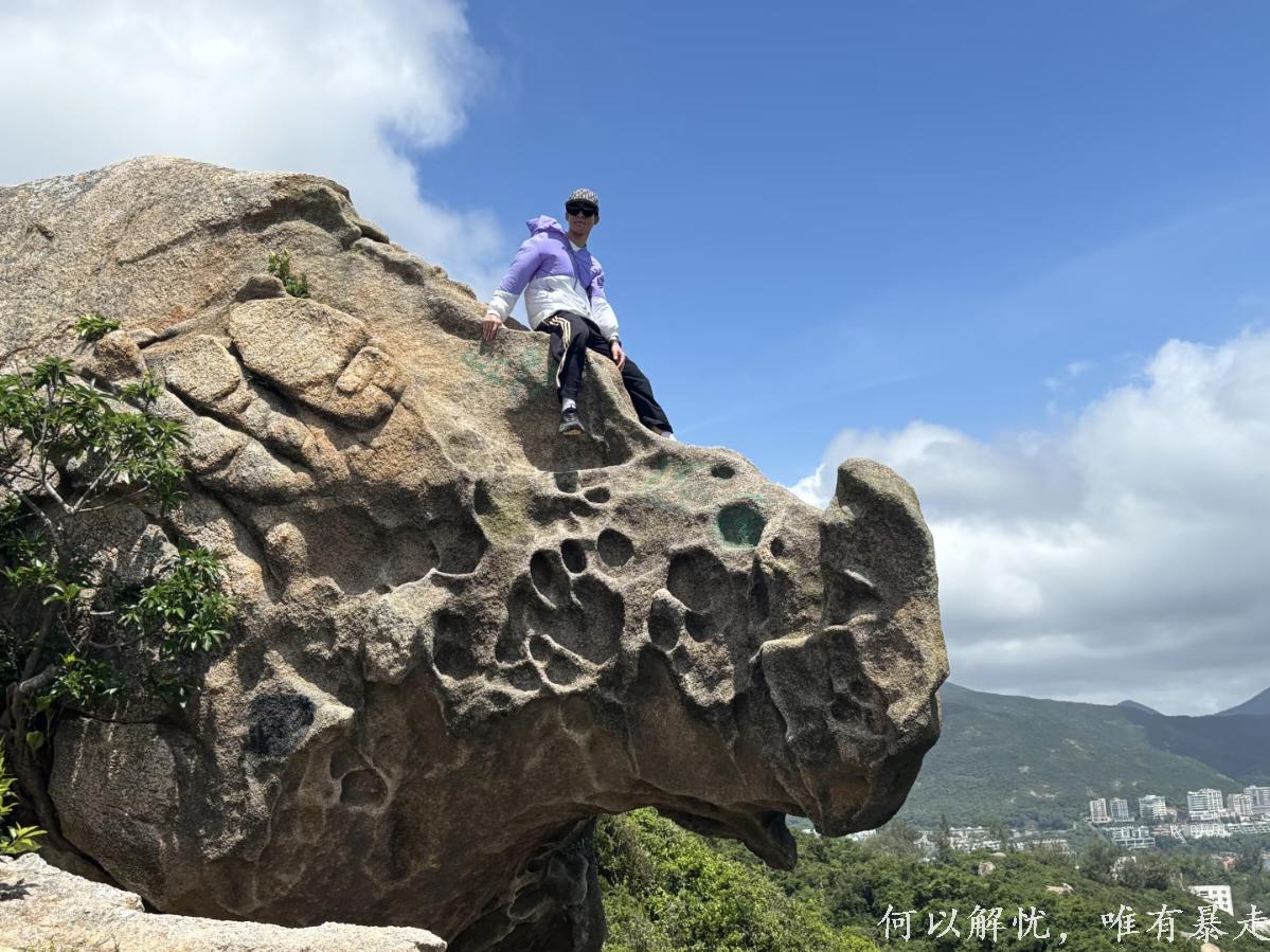 15:30到达赤柱犀牛石,犀牛石形神都似一头真的犀牛,是香港少有一眼就认得出的岩石。在犀牛石可饱览赤柱及大潭湾的清澈湛蓝海水,景色都十分优美。对岸为鹤咀半岛,小岛是罗洲,斜炮顶山坡上有众多突出的岩石,犀牛石:犀牛的头部、犀角与皮肤都很神似,下面海湾是大潭湾。