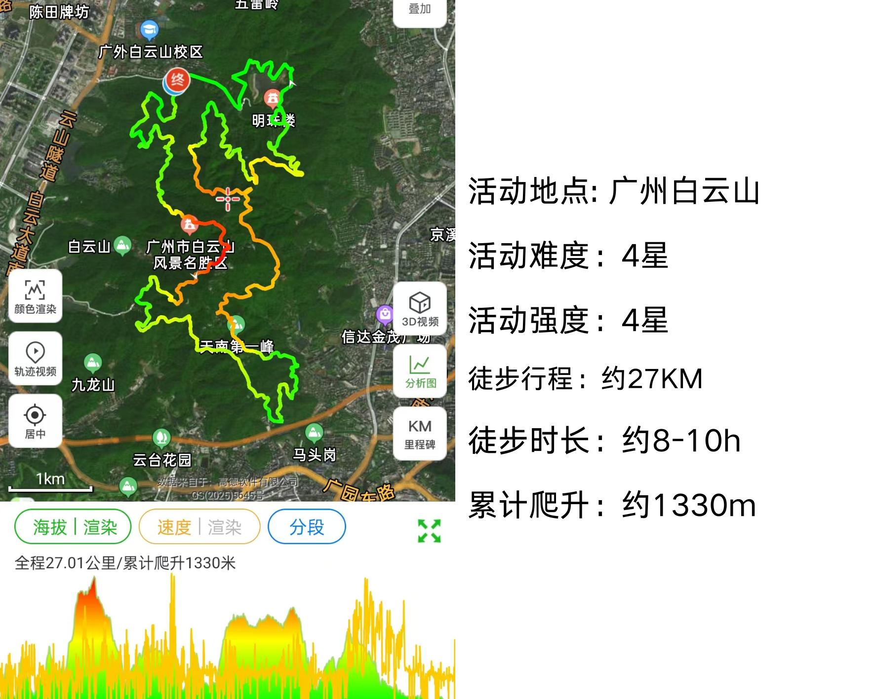 路线从白云山西门出发,大部分爬升集中在前15公里,这意味着在体力充沛的时候,可以挑战更多的爬升。后半段的爬升较少,更容易完成整个路线。