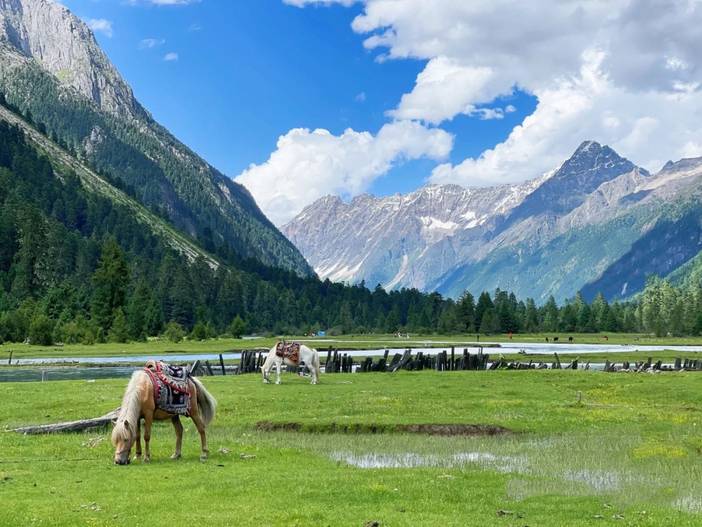 早餐后前往秘境之地【新措】,开车约1小时盘山路后,我们到达这片原始之地门口附近。一路上大片的牧场,蜿蜒溪流,牛马群、木屋、原始森林、雪山、野花、草甸汇集这里,仿佛闯入人间的天堂。原始秘境不过如此。