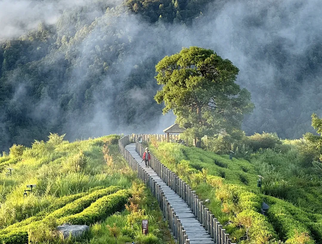 早餐后出发,先来到【格林村】观景台停车场,需要经过一片茶园—【缥缈茶园】,就能登上莲花状的观景台,近处是成片翠绿的茶叶,远处是青蓝的天空和圣洁的云烟,由衷感慨:凡间仙境不过如此。