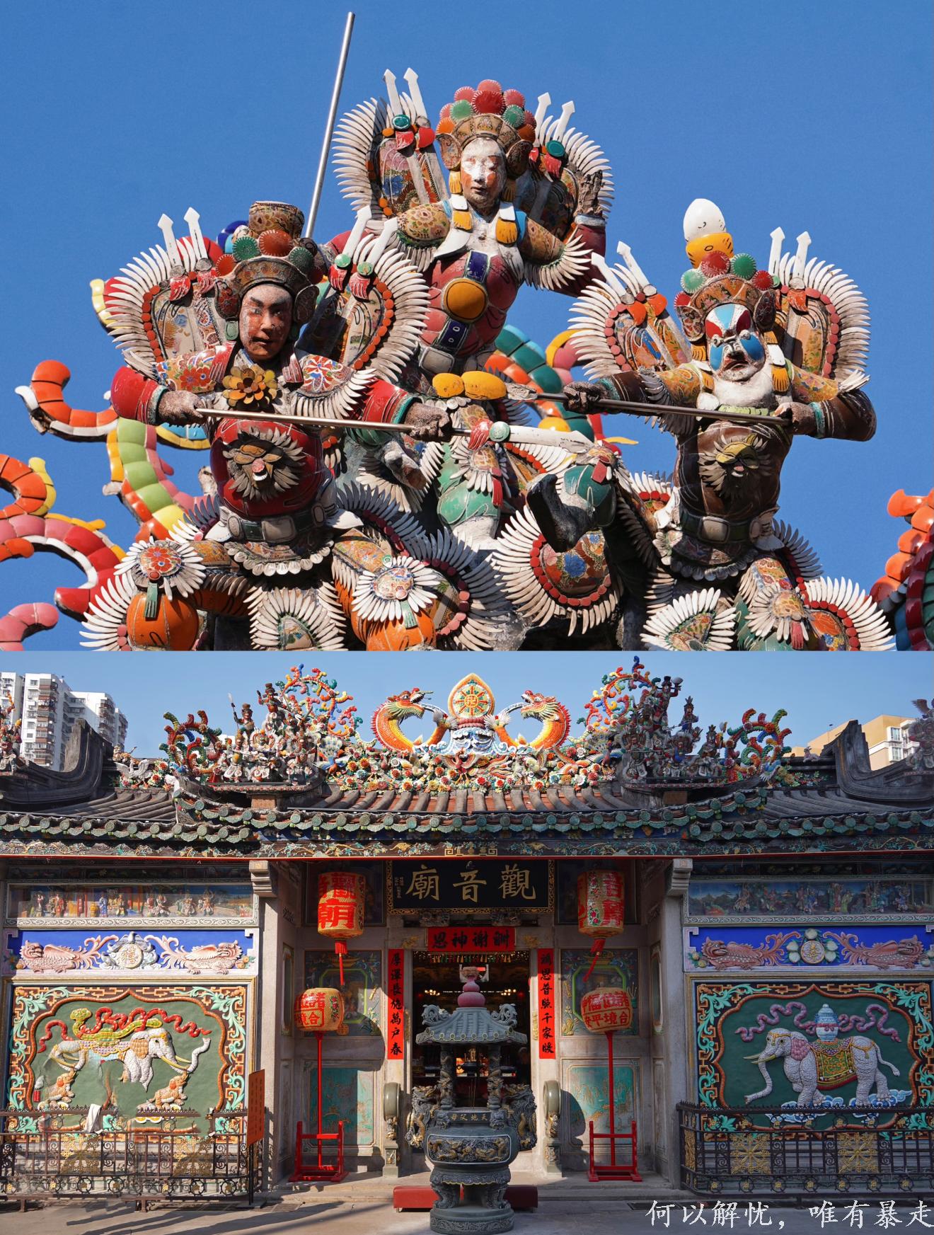 作为国家级非遗,庙顶和照壁上的嵌瓷堪称视觉盛宴。屋顶有200+神仙人物群像,如“二龙戏珠”“赵云救主”等,每组故事都配有铭牌;照壁则有“九龙壁”“鲤鱼跃龙门”等经典题材,瓷片拼贴细腻生动,在海风侵蚀下依然色彩鲜亮。