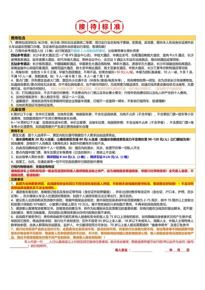 14、意见反馈提示:请每位游客务必在当地认真填写《游客意见反馈书》,如因游客虚填或不填而产生的服务质量后续争议恕不受理。若旅游行程结束后产生旅游接待质量方面的投诉,均以客人在当地填写的意见单为准,请客人如实填写并签名,否则我社概不受理。