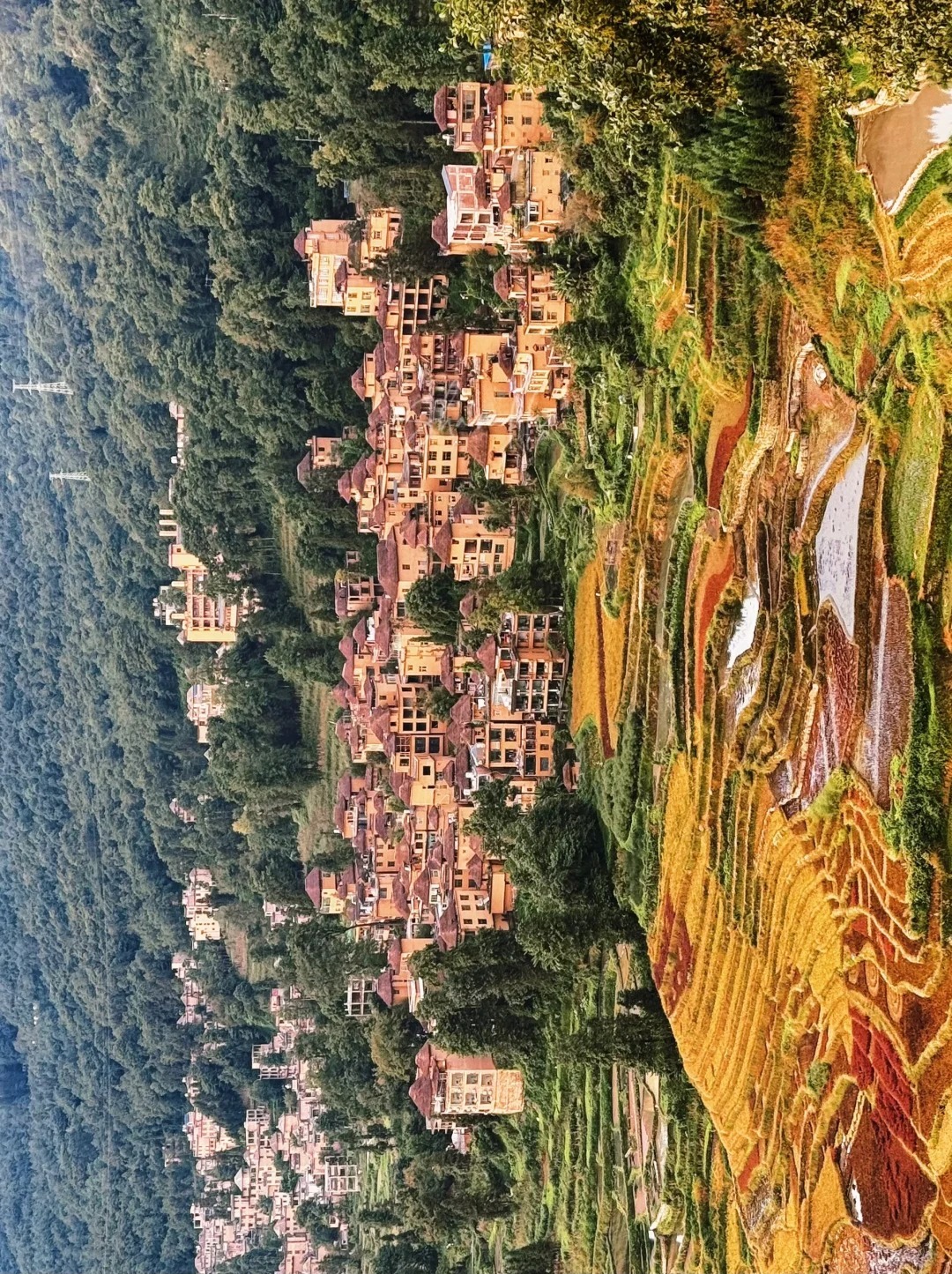 “山神水下阿姐正在洗衣服,转角处偶遇染布的阿婆,蘑菇房的小晒台上,彩衣迎风招摇,祭祀房和晒秋场旁,老人提着白萝卜正慢慢往上爬;古树广场和彩色梯田观景台,沿途梯田风光尽收眼底;