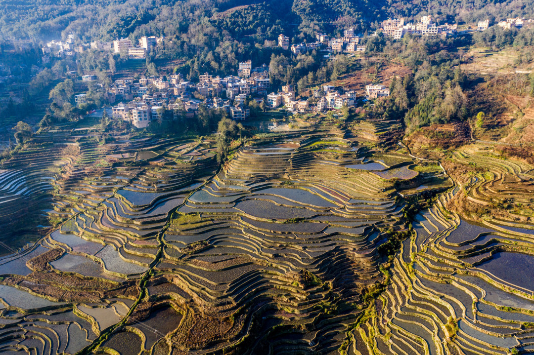 梯田集中连片核心区域主要有坝达、多依树、老虎嘴等 3 个片区。多依树的梯田适合观赏日出,清晨阳光洒在梯田上,金光漫射;坝达梯田有 3700 多级,日落时景色壮观,冬春灌水期可见 “千万颗太阳散落” 的奇观;老虎嘴景区的梯田形似奔腾骏马,气势恢宏,被誉为 “大地雕塑”。