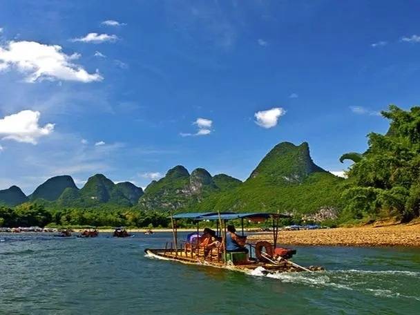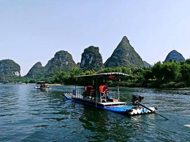 14:00草坪码头【坐竹筏游漓江】世界著名的漓江蜿蜒流于该镇西南部,境内江段长达20多公里,两岸群峰连绵,如剑芒排扦,奇特怪异,万态千姿,绿水滢回,青山环列,倒影幢幢,翠竹成林,垂柳如茵,泛舟江心帆星点点,相映成趣