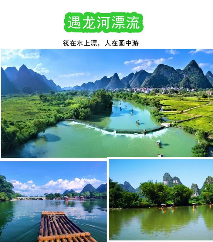 9:00【遇龙河多人竹筏】(门票已含,游览时间约为1.5小时)人称“小漓江”,不是漓江胜似漓江。在其上泛舟漂流,赏两岸桂林山色,才不虚此行。两岸山峦百态千姿,河畔翠竹叠嶂,蕉临四季常青,沿岸地稻田一年四季颜色不断变化,田野里一片生机勃勃,诗情画意尽显其中。