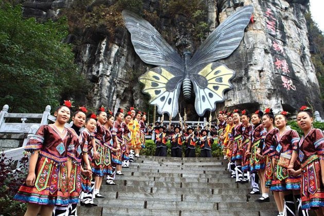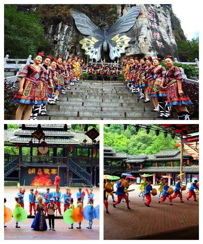 14:00前往游览蝴蝶泉,景区内奇峰叠彩、洞穴生辉、瀑布飞溅、泉水潺潺、山道盘旋、曲径通幽,登上南天门的观景台,犹如从天上看人间,十里画廊美景尽收眼底。泉边嬉水,高山攀岩,可以毫不夸张的说:“不游天籁·蝴蝶泉,不知十里画廊美景”。除了这些你从未见过的绝佳自然人文景观。难得的是景区注入了民族文化元素。侗族吴氏传人第101代寨主吴金敏先生加盟景区,带来了原汁、原味、原生态的侗歌苗舞,极大的丰富了景区民族文化内涵。