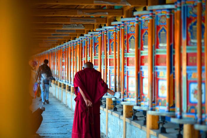 我们换乘当地交通进入佛学院,自由穿梭在这片红色的海洋中,入目处尽是朱红的佛色,裹着红袍的僧人在其间穿行,空气里弥漫着佛香。在金红相间的佛学院漫步,学着僧人面目虔诚地转经、朝拜,在触动转经筒的旋转中,感受“信仰”的具象化。