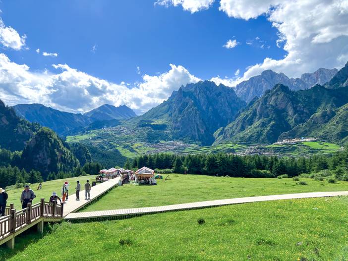 在群山环绕之中,有一处大片的草坪,平整的木栈道,那就是【仙女滩】在这里可以一览无余的饱览整个扎尕那山峰的全景。在这里漫步,野花在草场上竞相绽放,只为一睹扎尕那的美丽。除了观景台观景,有时间体力兴趣还有徒步穿越线路,也可以观光车+徒步+骑马等方式(费用需自理)