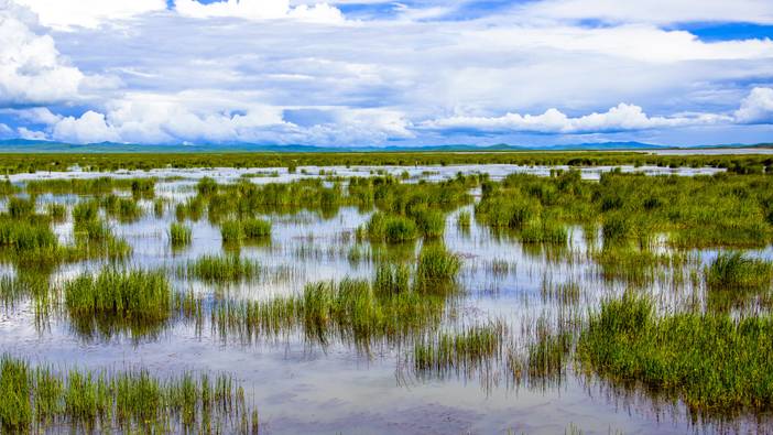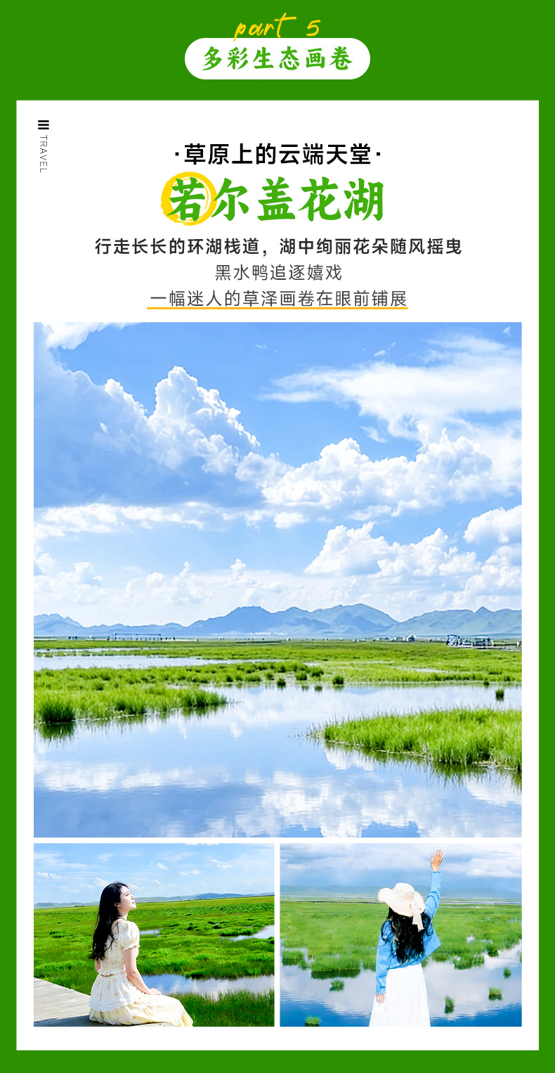【若尔盖花湖】(车程约35KM,车程约40min,游玩约2-3小时),镶嵌在川西北高原的“天空之镜”,是中国ZUI美的湿地明珠之一。夏季来临,3000余亩的湖面化作缤纷花毯,狼毒花、格桑花与鸢尾花在碧水间肆意绽放,黑颈鹤优雅掠过如镜湖面,留下圈圈涟漪。木质栈道蜿蜒深入湿地,倒映着流云与远山,仿佛行走在水天交界处。秋日水草泛金,冬季冰晶凝玉,四季轮回间始终保持着遗世独立的纯净。随后途径【若尔盖草原】。