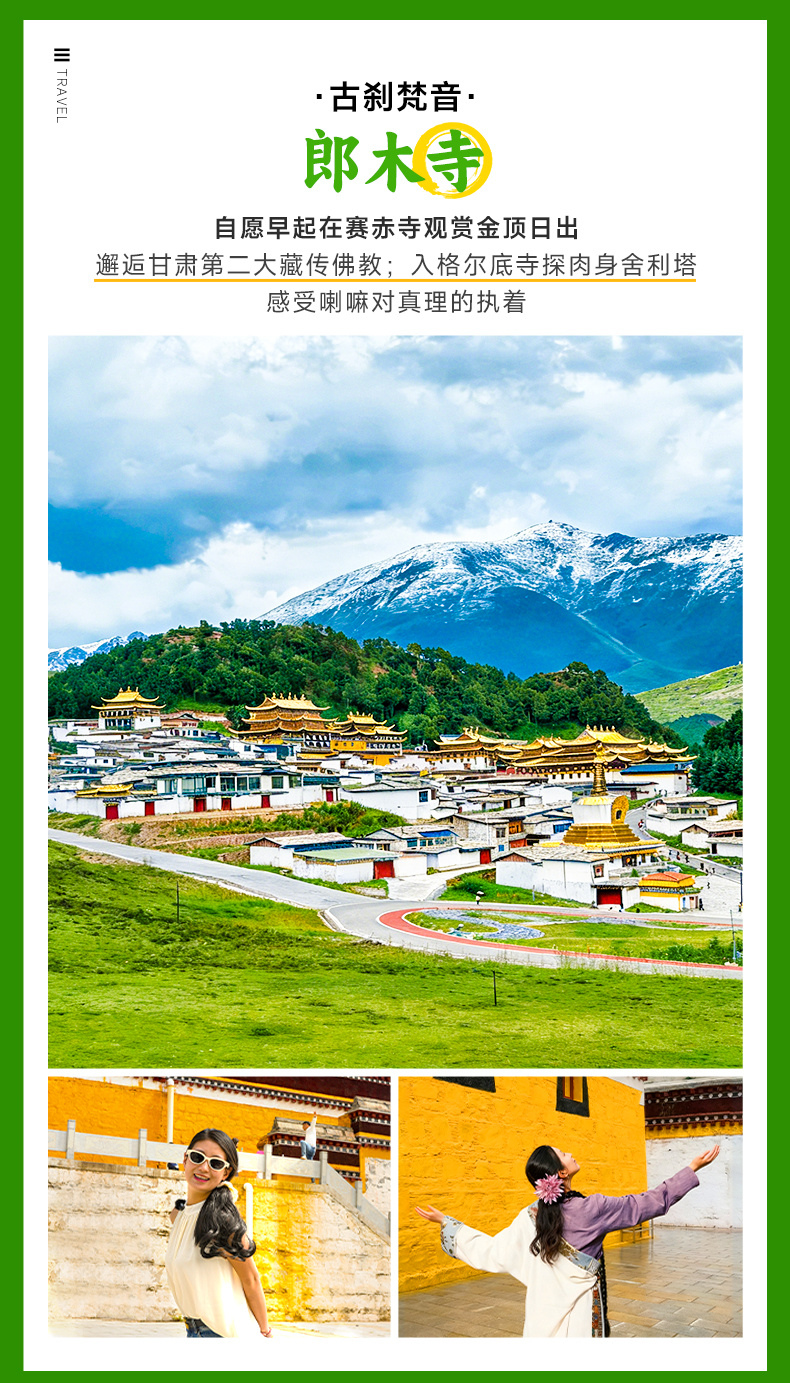 适时前往“东方小瑞士”【郎木寺镇】(车程约100公里,用时约2小时),随后步入四川境内的【格尔底寺】,其内供奉着百年不腐的活佛肉身,有佛缘即可参观。