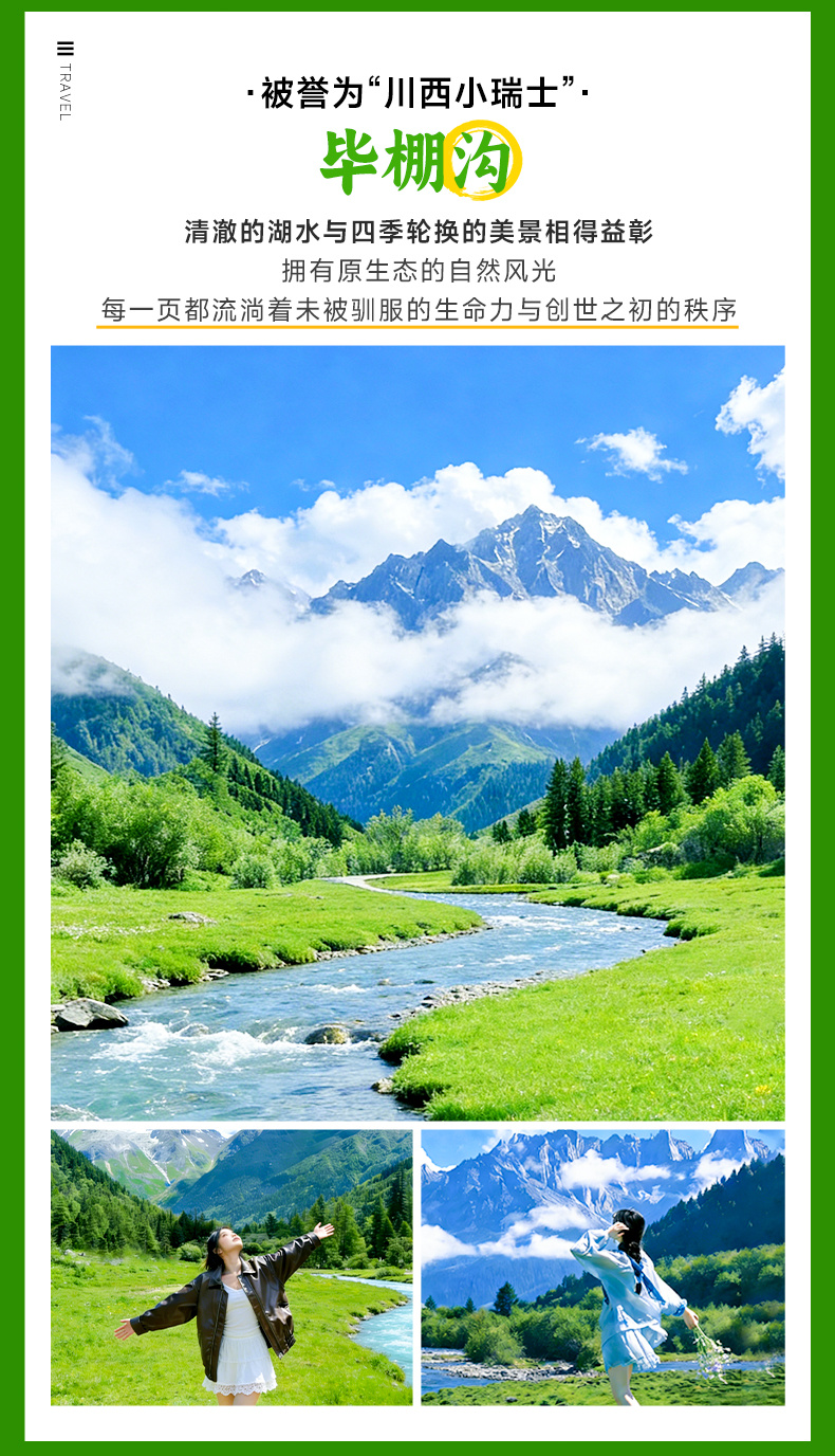 吃完早餐后,我们前往具有“川西小瑞士“之称的【毕棚沟】(车程约130公里,用时约2小时,游玩约2小时),毕棚沟的四季,是时间本身在这里显形——冰川是它沉思的额头,彩林是它迸发的灵感,海子是它未曾写完的句子。这并非一处风景,而是一册被山神打开的、关于“美”如何起源的山水原典,每一页都流淌着未被驯服的生命力与创世之初的秩序。雪峰、冷杉与草甸所构成的,一种令世界瞳孔放大的似曾相识。然而它的底色,终究流淌着藏地独有的苍茫诗意:经幡是风中的标点,海子是跌落天际的碎镜,而散落的牦牛与碉楼,则是画卷上最深沉的生命注脚。这并非东方的复刻,而是群山以更野性、更本真的笔触,写下的另一部关于“人间净土”的恢弘定义。