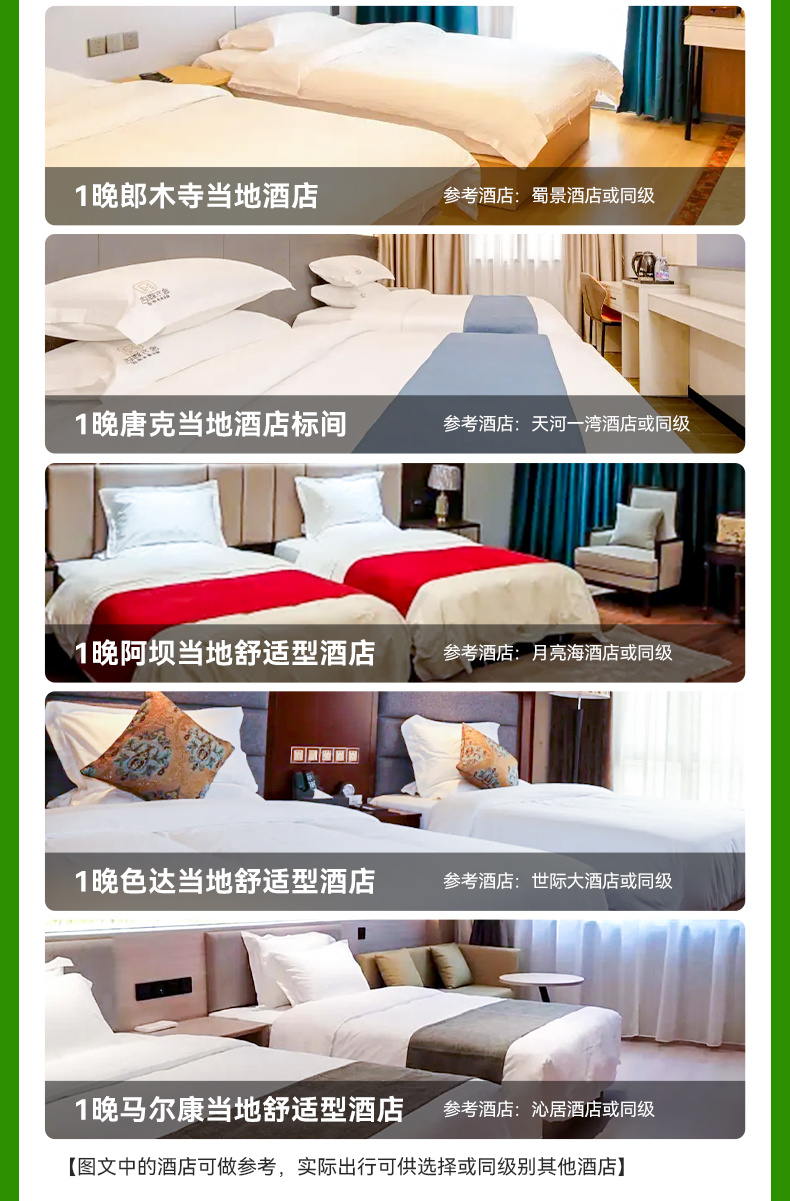 3、 行程中的所列的酒店类型,2星/2钻=经济型;3星/3钻=舒适型;4星/4钻=高档型;5星/5钻=豪华型;意为评定或条件到达相应标准的酒店,少部分地区,由于政策等因素,可能存在酒店条件满足,但未进行星钻评定的情况;