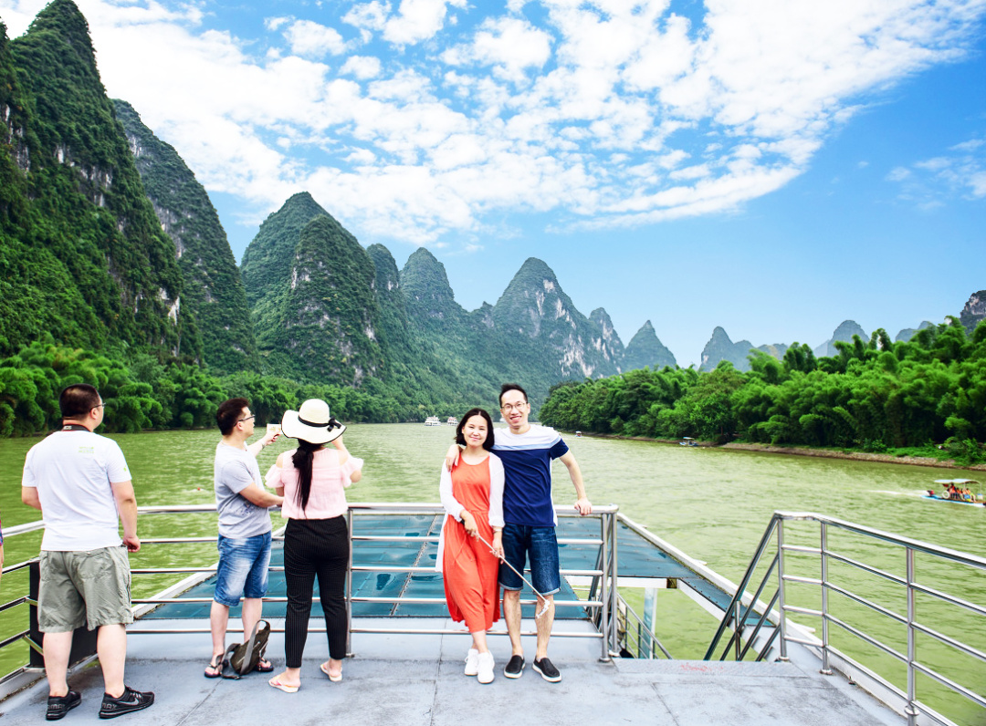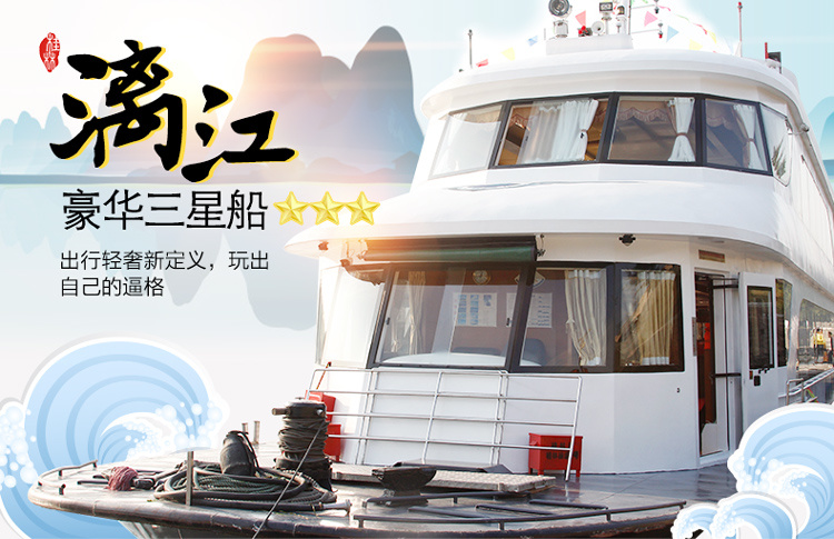 乘三星船/主题豪华船游览国家AAAAA级景区【大漓江风光】沿着这条青绸绿带,盘绕在万点峰峦之间,其中奇峰夹岸、碧水萦回、削壁垂河、青山浮水、风光旖旎、犹如一幅百里的画卷,