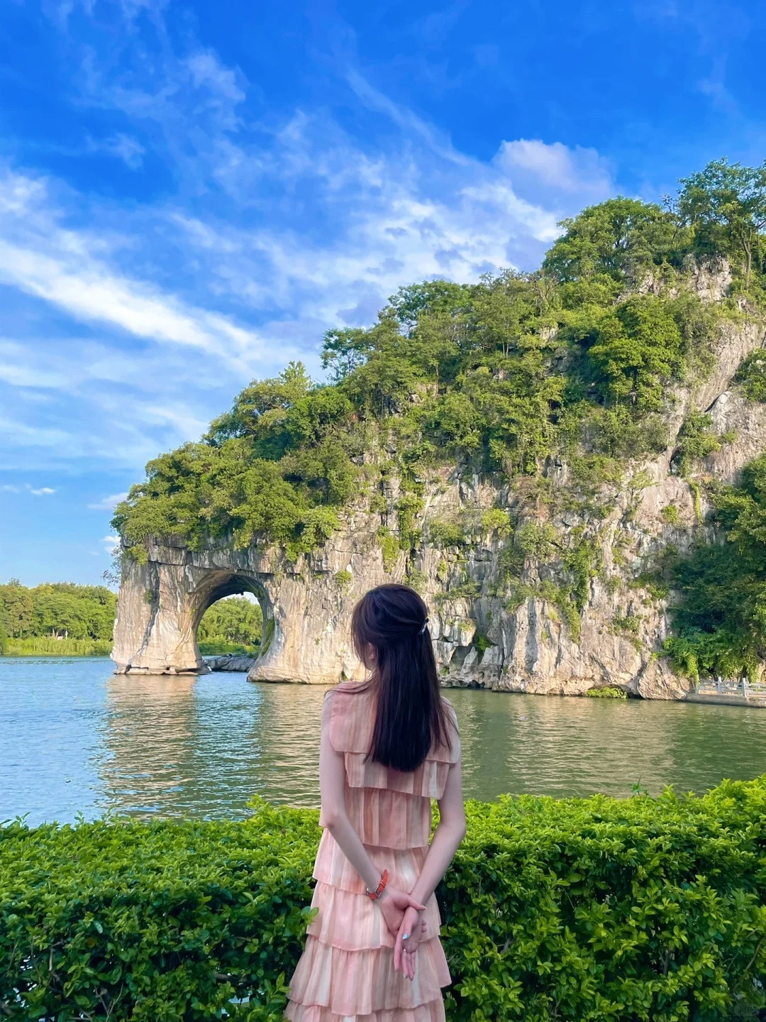 桂林市山水代表、城市象征——城徽,其山酷似一头驻足漓江边临流饮水的大象,栩栩如生,引人入胜,山体前部的水月洞,弯如满月,穿透山体,清碧的江水从洞中穿鼻而过,洞影倒映江面,构成“水底有明月,水上明月浮”的奇观。