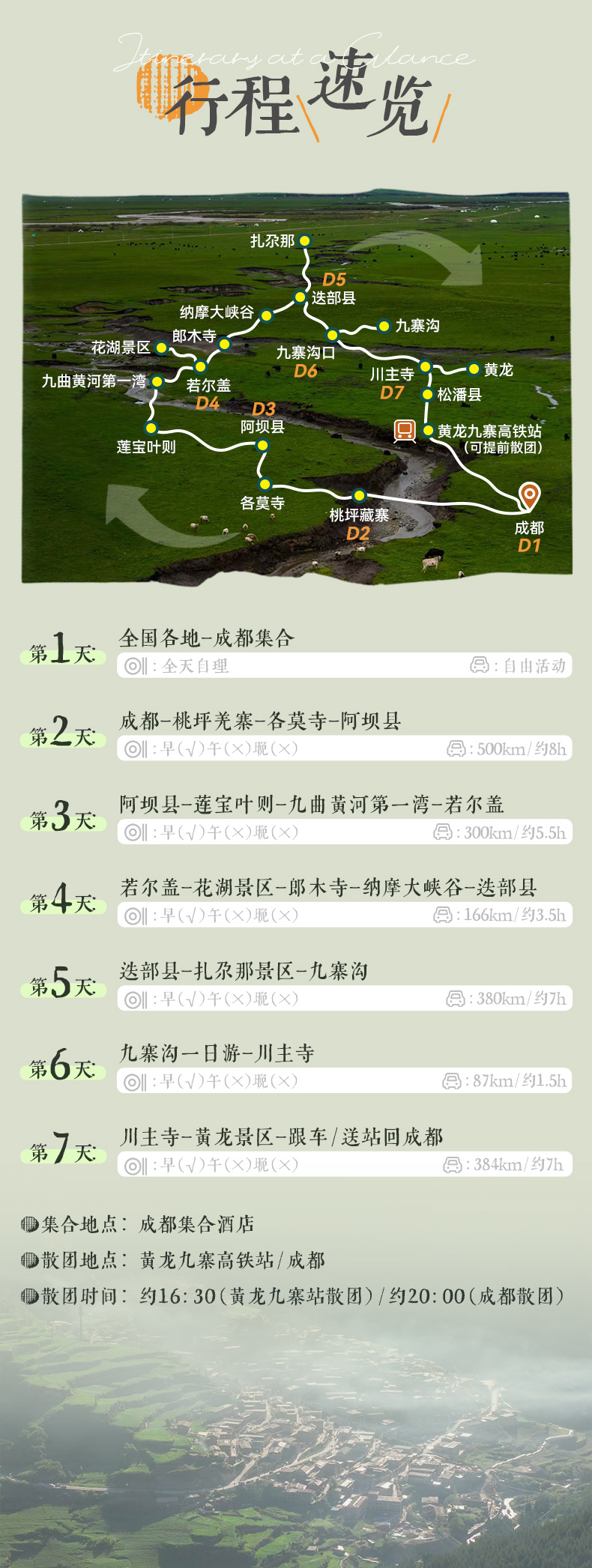 今天是解散日,美好的旅程就快结束了,您可以选择在黄龙九寨站散团,结束本次行程,今日返回成都约384公里,车程比较长且辛苦,敬请知晓。