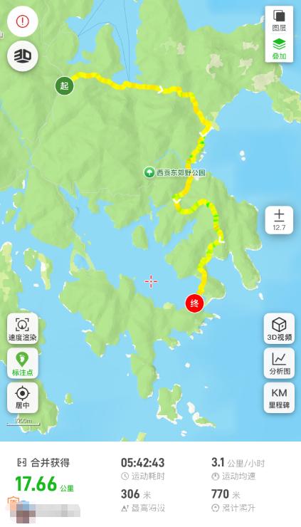 麦理浩径1、2段,全程约19公里,累计爬升778,第一天约10公里,第二天约9公里,需要在海边露营