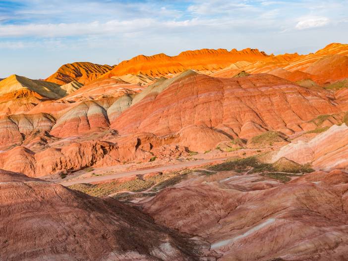 16:30抵达【张掖七彩丹霞】,这里就像上帝不小心打翻了颜料盒,涂抹的山间色彩斑斓,宛如七彩缎带。我们时间不赶,可以尽情地在这里观看【丹霞日落】,夕阳的光线打到丹霞岩壁上,美不胜收。