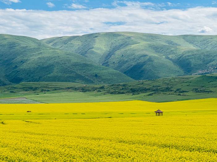 14:00前往【门源花海】(花期预计为6月末到7月末,非花期改为张掖大佛寺参观)。远方耸立着雄伟的祁连山脉,山脉的峰顶上【岗什卡雪山】(也称冷龙岭)白雪皑皑,百里油菜花海就在祁连山和达坂山之间呈现出一幅气势磅礴的天然画卷。
