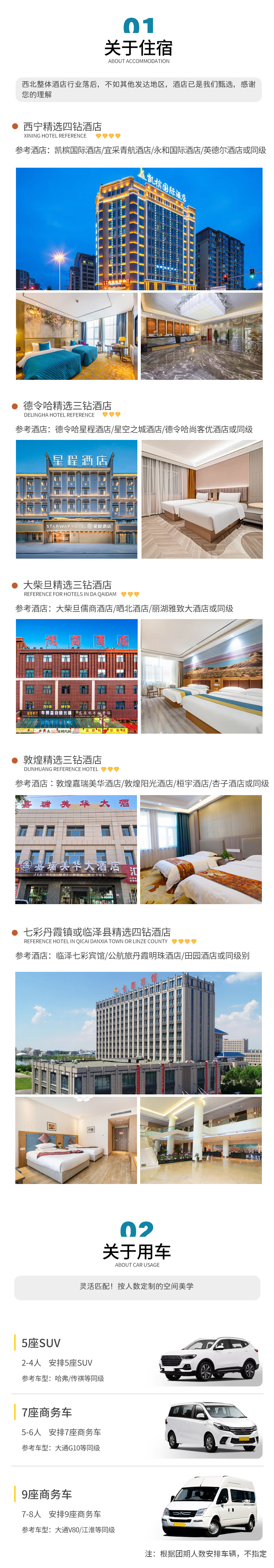住宿:西宁市4钻酒店标间1晚、德令哈3钻酒店标间1晚、大柴旦3钻酒店标间1晚、敦煌3钻酒店标间2晚、临泽县或七彩丹霞镇4钻酒店标间1晚